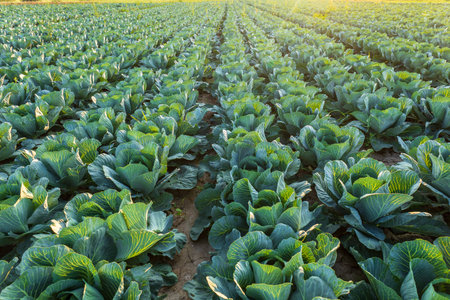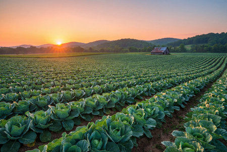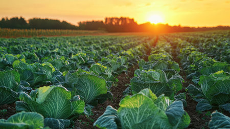 Cabbage plants grow abundantly in a vast field, basking in the warm glow of the setting sun, signaling a successful harvest time.