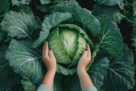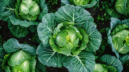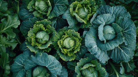 Vibrant field of fresh, green cabbage heads thriving in a rich, organic garden