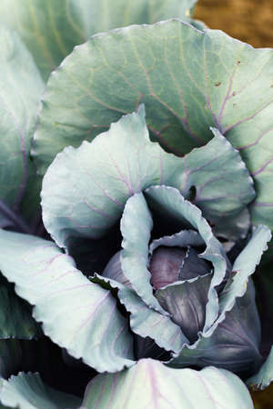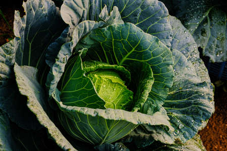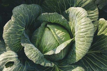 Ripe natural cabbage growing in garden. Concept agriculture. Top view.