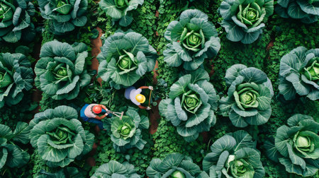 Farmers harvesting cabbage in a lush field surrounded by rows of healthy, green cabbage heads Generative AI