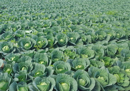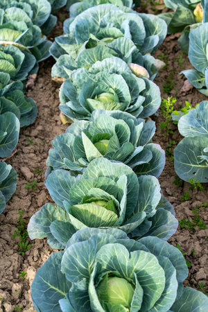 Ripe cabbages in an agricultural vegetable field before harvesting.