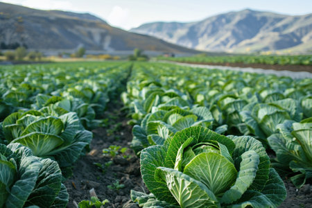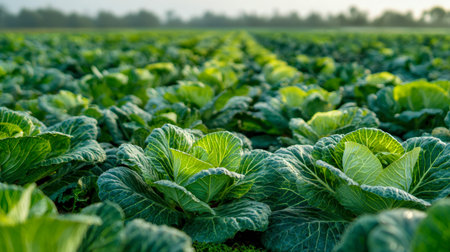 This stunning stock photo captures a vibrant cabbage field under a hazy morning light. Rolling hills create a serene backdrop, showcasing agricultural beauty in nature.