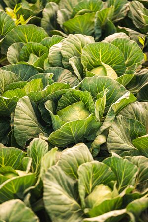 Fresh green cabbages growing abundantly in a garden during the early morning light of spring