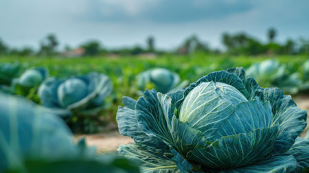 Close-up view of fresh green cabbage growing in a vast agricultural field, showcasing vibrant colors and the beauty of nature under a blue sky.