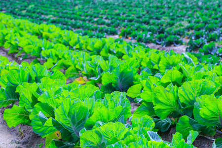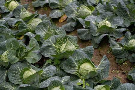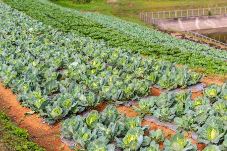 Fresh cabbage in harvest field. Cabbage are growing in garden. Organic vegetable background in freshness atmosphere farm on mountain with mist in morning. Agriculture concept.