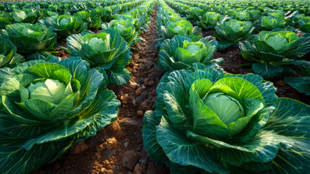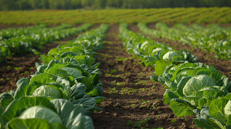Rows of vibrant green cabbage plants thrive in a sunny agricultural field. Fresh healthy vegetables growing in fertile soil on a farm.
