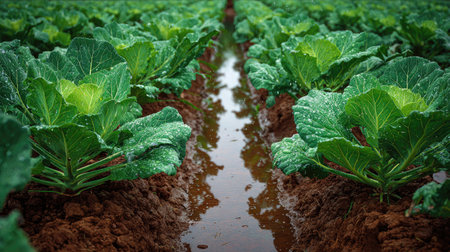 Vibrant, healthy cabbage plants with glossy leaves spread across a neatly cultivated field, showcasing fertile soil and attentive farm management.