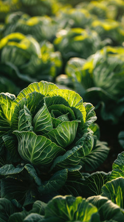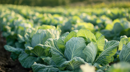 Close-up of healthy green cabbage leaves in a sunlit vegetable field, vibrant and fresh. Sustainable agriculture and organic farming concept