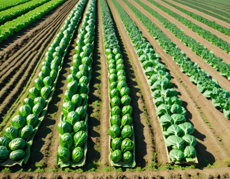 Neatly lined up young cabbage plants basking in the sun on a farm, illustrating vibrant agricultural growth and freshness.