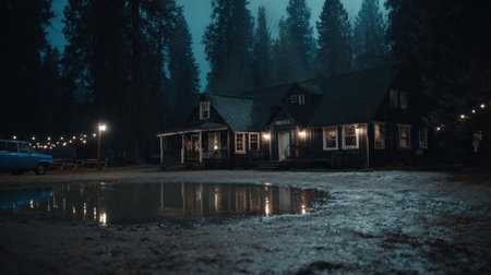 Dimly lit, traditional wooden structure, resembling a mountain lodge or cabin, sits surrounded by tall, dark trees under a night sky. The foreground features a muddy area with a large puddle perfectly reflecting the warm lights emanating from the building's windows and nearby lamppost, while strings of decorative bulbs hang to the side near an older model automobile.