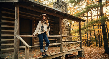 A girl in a hat and a plaid sweater is standing near a wooden house in the autumn forest.