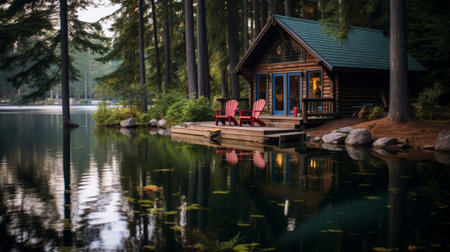 compact wooden cabin nestled in lush greenery by a calm lake, created with generative ai