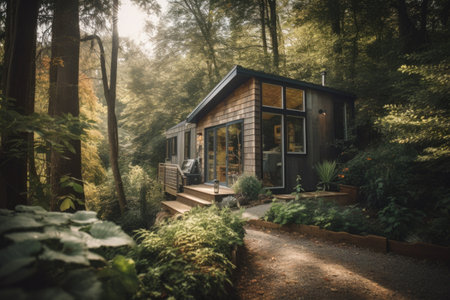 tiny house nestled among the trees, surrounded by natural beauty, created with generative ai