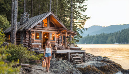 Cozy Log Cabin Getaway on a Tranquil Lake at Sunset, Woman Walking Towards Camera, Welcoming Retreat