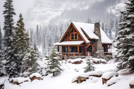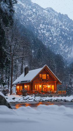 Beautiful wooden cabin nestled in a winter wonderland, surrounded by majestic mountains and evergreen trees, offering a peaceful retreat in nature's embrace.