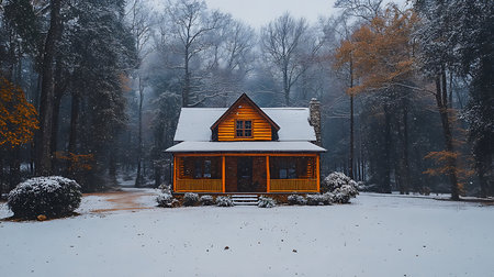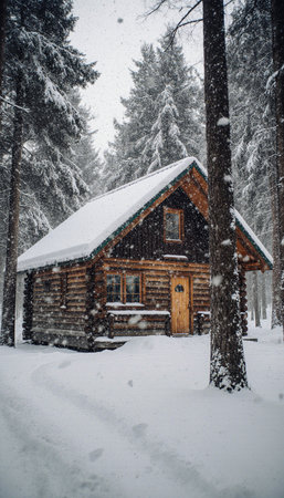 Tiny cabin surrounded by snow-covered pines in winter AI generated