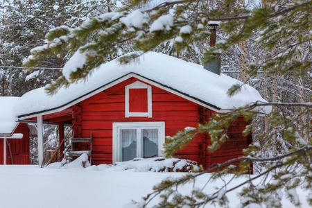 Beautiful winter landscape with snow covered house in the forest. Finland