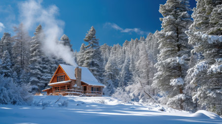 A cozy wooden cabin stands proudly amidst a blanket of fresh snow, smoke curling gently from its chimney into the crisp winter air. Tall evergreens surround the structure, their branches heavy with frost, while a serene quiet envelops the scenery. The scene evokes a sense of warmth and tranquility, promising shelter from the cold.