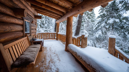A picturesque wooden cabin balcony covered in snow, surrounded by tall pine trees. The serene environment creates a perfect winter retreat for relaxation and tranquility.