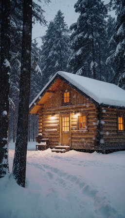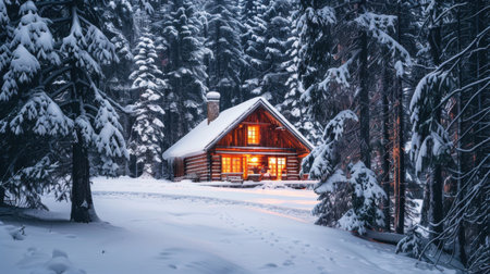 A picturesque cabin nestled in a snow-covered forest, radiating warmth from glowing lights. This scene evokes a sense of tranquility and serene beauty in winter.