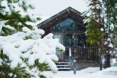 White Christmas in winter cabin in the woods between snow covered spruce trees.