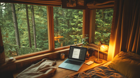 Laptop and cup of coffee on a wooden table in the forest