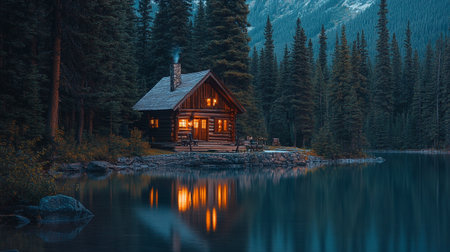 Nestled in a winter wonderland, a quaint cabin exudes warmth as twilight sets in. Snow blankets the ground while smoke curls from the chimney, creating a peaceful scene.