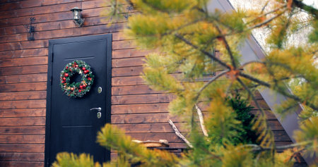 Christmas wreath on house door, sparking holiday spirit. Festive scene as wreath enhances door, reflecting Yuletide joy. Christmas wreath symbolizes warm, festive Christmas mood.