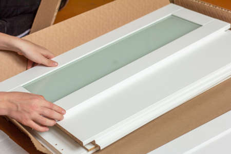 Unpack the furniture. The process of unpacking new furniture. The concept of assembling and purchasing furniture. A man collects furniture.