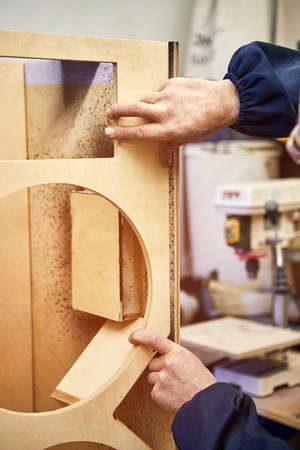 master carpenter measures the cabinet door with a ruler. Production of handmade wooden furniture. Selective focus