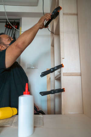 Man using clamps to hold workpiece gluing. DIY project at home.
