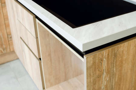 Fragment of built-in kitchen furniture. Elements of a table top, facade, connection of parts.