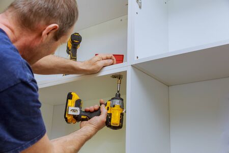 Assembling furniture white in modern kitchen screws using a screwdriver.