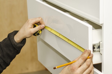 Male hand measuring cupboard door in kitchen