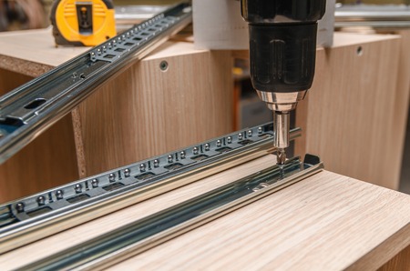 Assembling furniture, installing guides for drawers on furniture panels close-up.