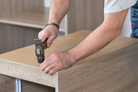 Craftsman hammering a nail an old hammer when assembling new furniture