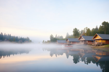 morning fog lifting, revealing lakeside cabins