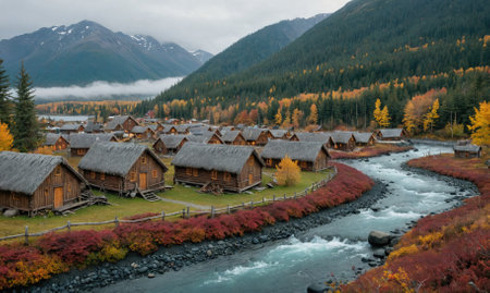 Smoke is rising from chimneys of cozy wooden cabins nestled in a picturesque mountain village surrounded by vibrant autumn foliage