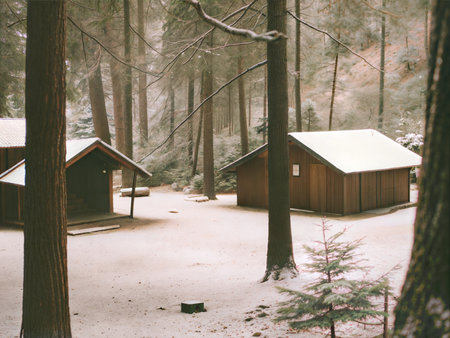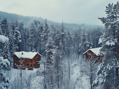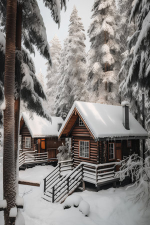 Wooden cabins nestled in a snow-covered forest. Perfect for a winter getaway.