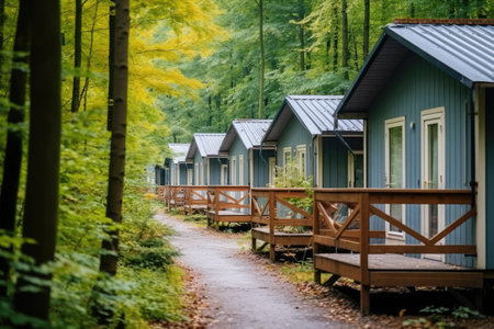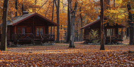 Rustic wooden cabins with charming porches line a quiet forest path, surrounded by trees with early autumn colors.