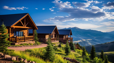 creekside cabins surrounded by alpine forest, created with generative ai