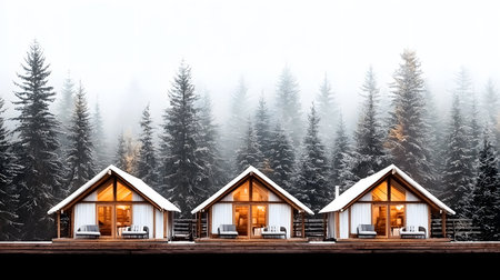 Three cozy glamping cabins with wood accents stand amidst snow-covered pines, creating a serene atmosphere. Misty background adds tranquility, inviting relaxation and rejuvenation.