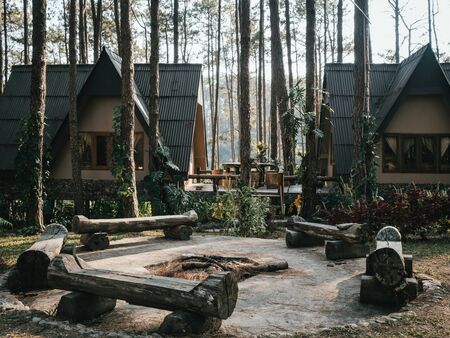 BBQ area in front of small twin European-style resort houses in a pine forest in Chiang Mai, Thailand, in an environment similar to Europe or Canada.
