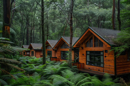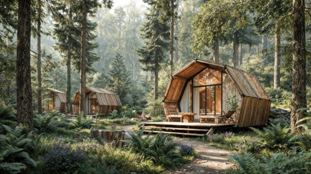 A row of wooden cabins in a forest among tall trees, surrounded by lush greenery and ferns, creating an inviting atmosphere for peaceful ecotourism activities.