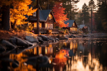 cabins nestled by a serene lake, embraced by lush trees, showcasing vibrant color contrasts. captured with fujifilm pro 400h, the image exudes a blend of light gray and amber, as well as emerald and crimson hues. this 8k photograph beautifully captures the essence of seaside scenes, reminiscent of the works of thomas moran. ai generated