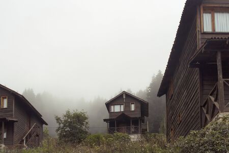 View of wooden houses at high plateau, trees in fog creating beautiful nature scene. The image is captured in Trabzon/Rize area of Black Sea region located at northeast of Turkey.