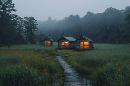 Peaceful retreat Two wooden cabins amidst fog in a serene grassy field on a misty day