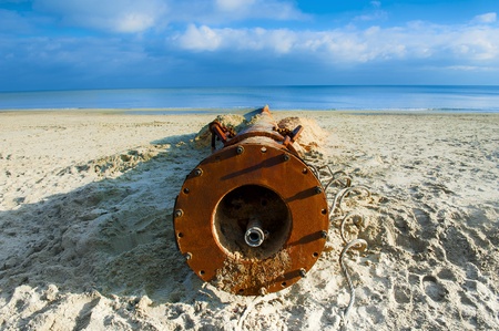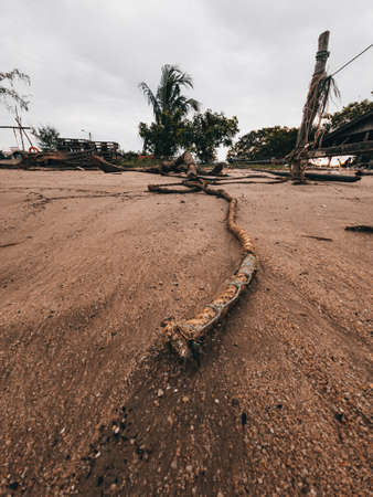 Ship old anchor rope with snap hook and line under sea. Steel shackle hidden in sand