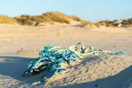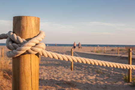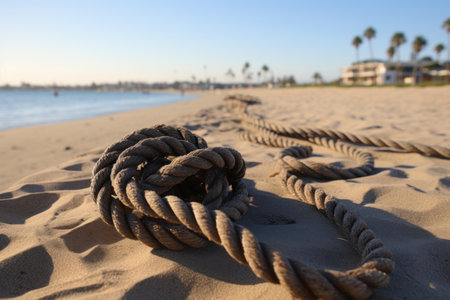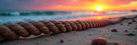 Close-up of a coiled ships rope on a serene beach with warm sunset light in the background