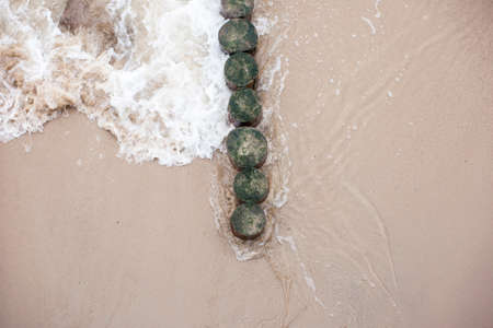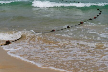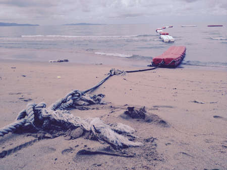 Thick rope floating on the waves of the sea water from the sandy beach. Danang beach, Vietnam